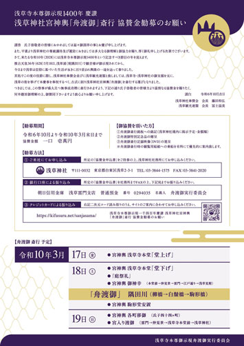 浅草寺本尊御示現1400年 慶讃 浅草神社宮神輿「舟渡御」斎行 協賛金勧募のお願い